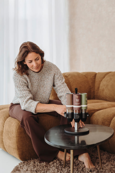 Welkom in onze wereld van stijlvol en bewust theedrinken. Jouw nieuwe TwisTea Display is niet zomaar een accessoire. Het is een eenvoudige en elegante manier om thee te bewaren, te doseren én te presenteren, met gemak en gevoel voor detail.